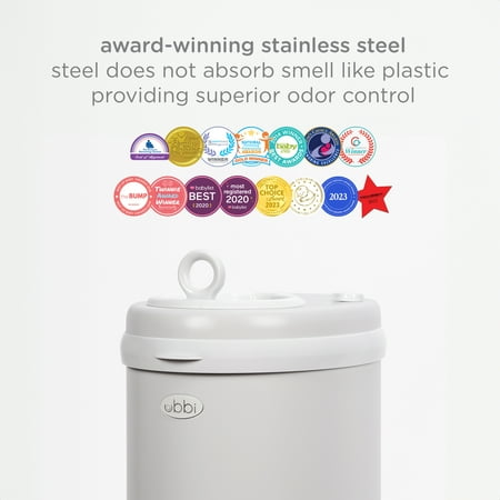The award-winning Ubbi Diaper Pail has earned worldwide recognition for its superior odor control and convenience, representing a breakthrough in the diaper disposal market. The Ubbi Stainless Steel Diaper Pail is crafted from stainless steel and provides maximum odor control. It’s rubber seals are strategically placed to lock in odors, and the innovative sliding lid minimizes air disruption, ensuring that unpleasant smells remain contained within the pail. The optional childproof lock keeps little hands out. Catering to the needs of modern parents, our baby diaper pail is compatible with any standard trash bags saving parents money and time. Strategically designed to be the easiest disposal system to load, use, empty, and clean. Enter the world of Ubbi where innovative products are designed and created with parents and children in mind. A wide range of Ubbi branded products is now available for today’s modern parents that are looking for stylish and functional baby essentials. Do not clean with any harsh abrasives or liquids - even water! Wipe clean with a dry cloth to prevent rust. No special bags needed. Dimensions: 19.5” H x 8.4” W x 11.4” D. Opening Size: 5 inches diameter. Holds up to 55 newborn sized diapers.