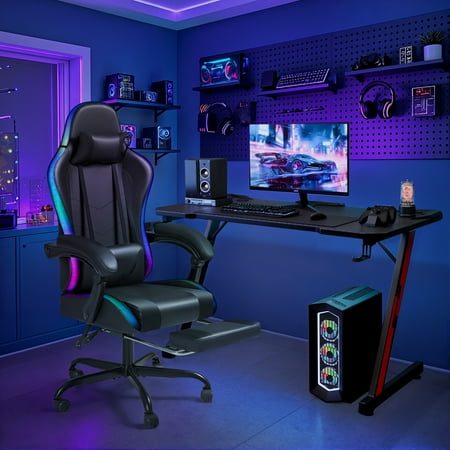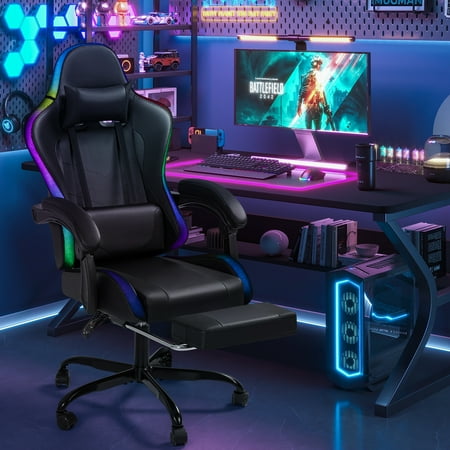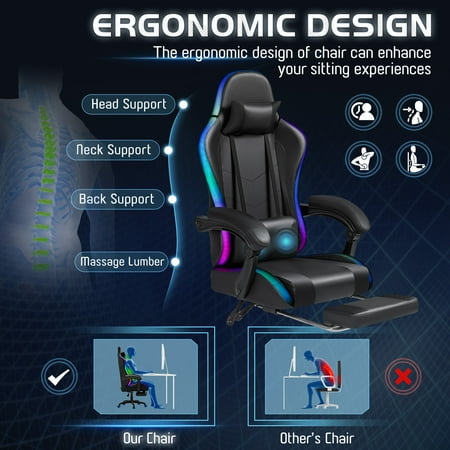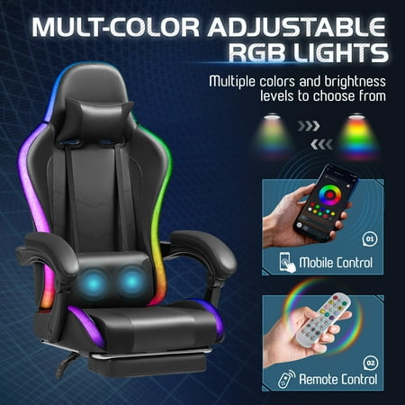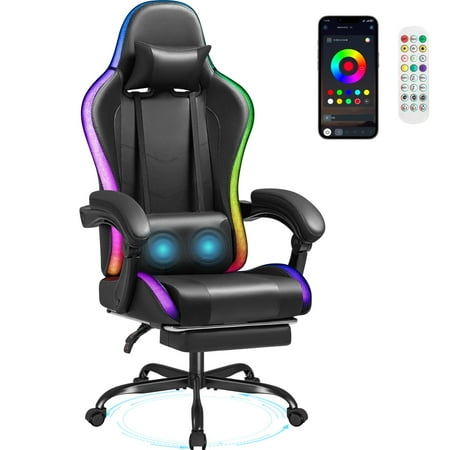 Homall RGB gaming chair offers impressive features for an enhanced gaming experience. It features embedded RGB LED light strips on the backrest and seat edges, allowing you to adjust lighting modes and brightness levels. The chair also includes a massage lumbar support function that can be adjusted for intensity and mode to relax your lumbar region and alleviate fatigue. Designed ergonomically with a headrest and lumbar support, it provides optimal neck and lower back support for spine relaxation. With adjustable height, backrest angle, and a retractable footrest, this chair caters to individual preferences. Crafted with premium leather, sturdy metal support, and high-quality materials, it ensures stability, comfort, and durability.