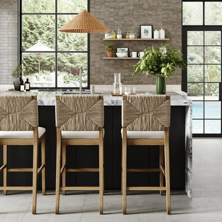 The Beacon bar height chair will surely make your bar area cozy and inviting! The seat is wrapped in a soft, textured cream boucle fabric, while the backrest is crafted from natural woven seagrass - the perfect combination for the ultimate boho vibe your bar or kitchen island needs. This 29 inch bar height stool is unique and charming, but it's not all that. The solid wood frame gives it the stability and function of a durable bar stool that will last for years. The Beacon upholstered bar stool with back is your perfect companion for a quick bite, coffee chat with family, or just a quiet moment with a book. Nathan James is the furniture company built for this generation. You don't need to spend a fortune to get quality design-first furniture, and when we say easy assembly, we mean it. Our guarantee is our word. Your purchase is backed by a 100% money-back guarantee. If you have any quality issues, contact us, and we will send you a replacement immediately—no questions asked. This product is not recommended for commercial use. Materials: - Natural Woven Seagrass - Boucle Upholstery Fabric - Rubberwood - Plywood - Foam Seat Assembly Must-Haves: - Packaging carton as working surface Weight Limit: - 300 lbs