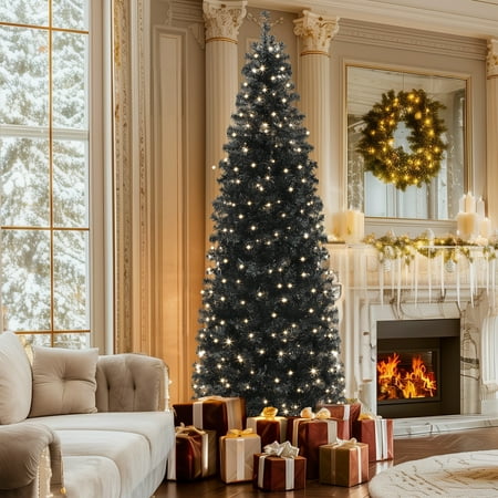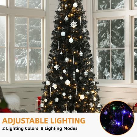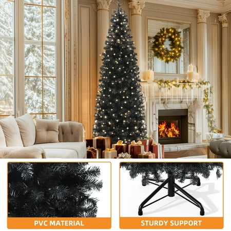 Product Description Add a modern twist to your holiday decor with our sleek black artificial pencil Christmas tree. Ideal for Christmas, Halloween, or any festive celebration, this space-saving tree features a slim profile that fits seamlessly into corners. Pre-lit with 200 LED lights and 8 lighting modes, it creates the perfect ambiance with a touch of a button. With 700 branch tips, it's lush, customizable, and effortlessly assembled with a sturdy X-shaped iron stand. Highlights -Pre-Lit Brilliance -Slim Pencil Shape -Durable Quality -Easy Assembly & Enhanced Stability Specifications Material: Polyvinyl Chloride Size:6FT Product Dimensions: 25.59"D x 25.59"W x 72"H Item Weight:9.8 Pounds Special Feature: Foldable, Prelit Seasons: Winter Recommended Uses For Product: Christmas, Home decoration Occasion: Christmas