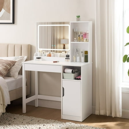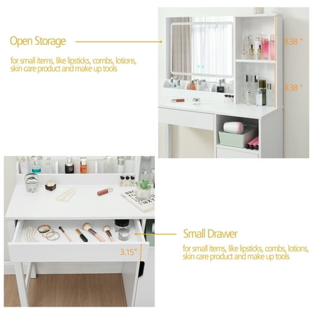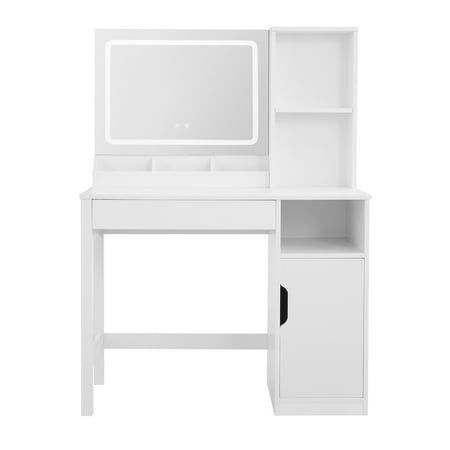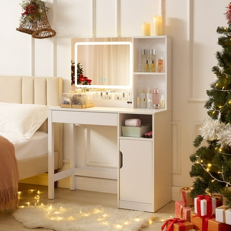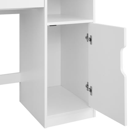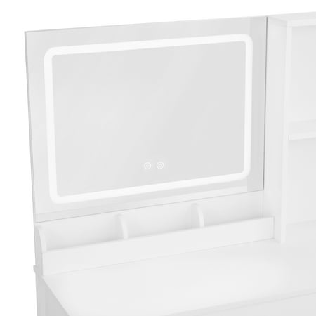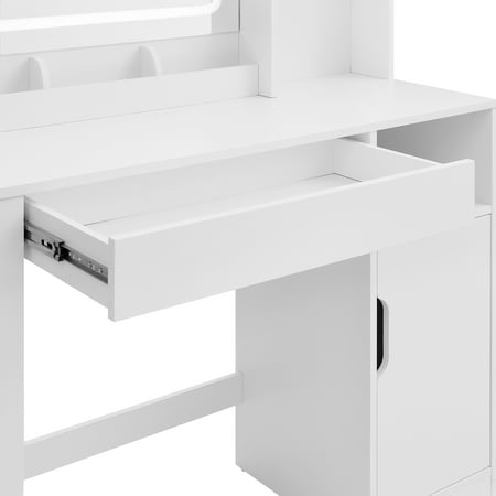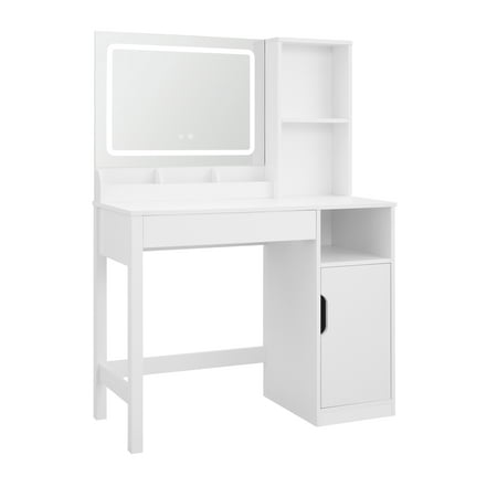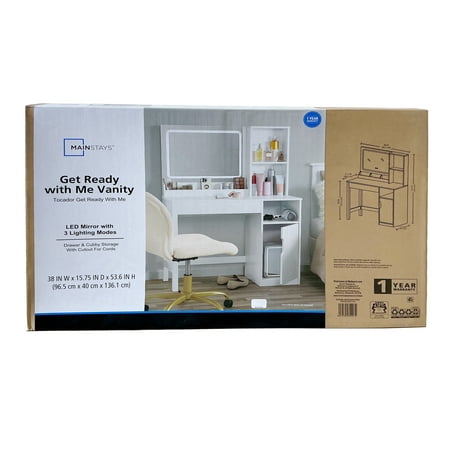 Upgrade your morning routine with the Mainstays Vanity Table crafted in clean white wood. This all-in-one unit includes a lighted mirror, perfect for precise makeup application. Its thoughtfully designed storage features two open shelves and a spacious cabinet, ideal for organizing perfumes and accessories. Built to last, this stylish vanity fits effortlessly into any room decor. Some assembly is required. Enjoy simplified storage and a touch of elegance daily.