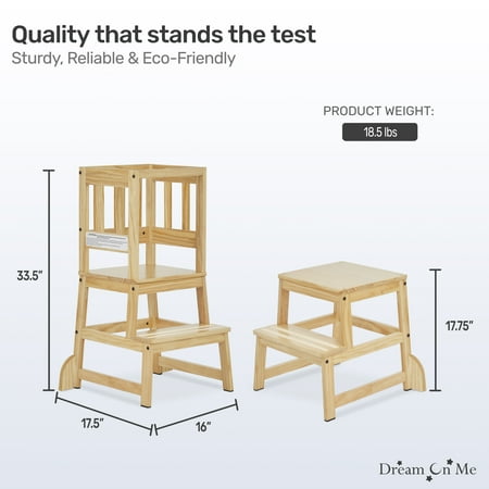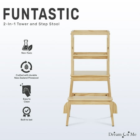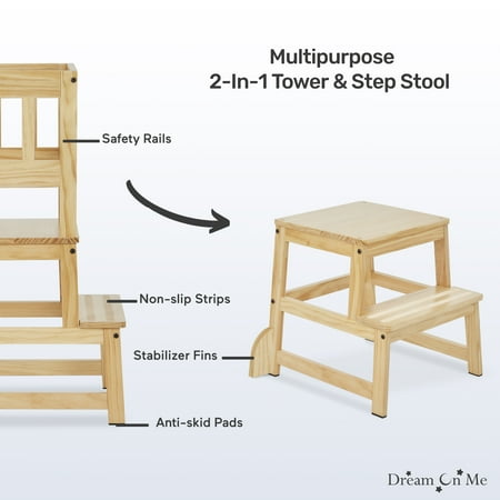 It’s time to elevate learning time… literally! Introducing the new & improved Dream On Me 2-in-1 Funtastic Tower and Step Stool – a must-have as your toddler grows to achieve new milestones. Take learning on the go, from room to room, with this sturdy piece that’s made of solid New Zealand Pinewood. Easy to assemble, it’s a multi-purpose stool that can be used in the kitchen to teach your little one simple cooking, in the bathroom as you teach them to brush their teeth, or even outdoors! Safety is the word in our world. This is why the Dream On Me Funtastic Tower and Step Stool is made of baby-safe, non-toxic paint and comes with an anti-slip top base, anti-skid bottom wings, and thoughtfully designed wooden safety rails for additional child safety. What’s more, it comes in 4 finishes to seamlessly fit into your home’s aesthetic – Black, Cool Grey, Natural and White. This product is meant for children aged 18 months to 3 years.