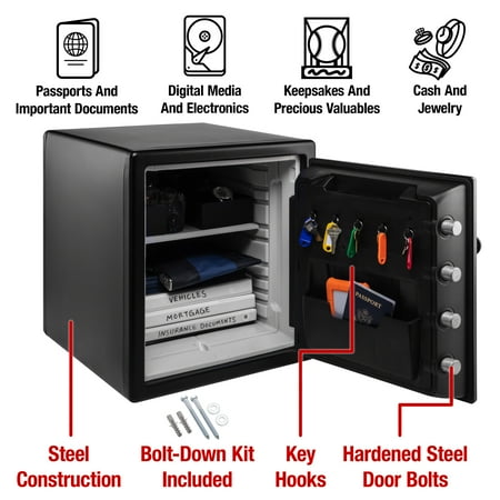 The SentrySafe Digital Water and Fireproof Safe SFW123CS offers reliable security for your valuables with solid steel construction, a pry-resistant hinge bar, and four large, one inch bolts. This one safe is designed with an interior key rack, door tray and door pocket to keep your items organized, this safe is ideal for your home and office security needs. Fire-resistant safe is UL Classified to endure 1 hour at 1700°F and keep interior temperatures safe for irreplaceable documents, valuables, DVDs, and USBs; ETL Verified to withstand a 15 foot fall during a fire and remain closed. Water-resistant safe is ETL Verified for 24 hours of protection in water up to 8 inches deep offering peace of mind in the event of a flood. Combination fire safe for strong security; digital combination safe features four live-locking bolts, steel construction, pry-resistant hinge bar, and shelf. Exterior: 16.3 in. W x 19.3 in. D x 17.8 in. H; door requires 14.75 in. of space to fully open; Interior: 12.6 in. W x 11.9 in. D x 13.8 in. H; large 1.23 cubic foot capacity; weighs 85.25 pounds.