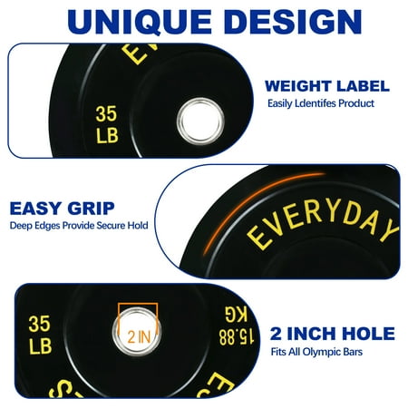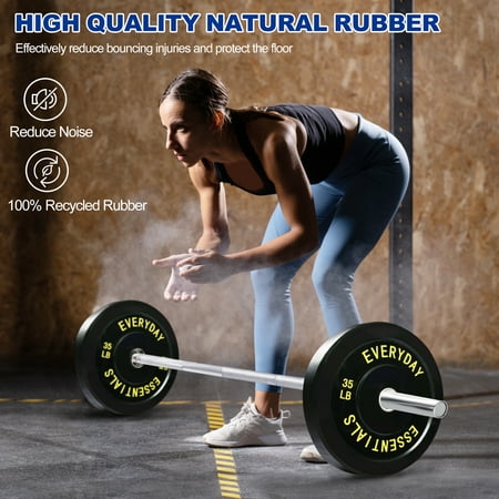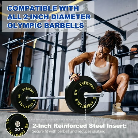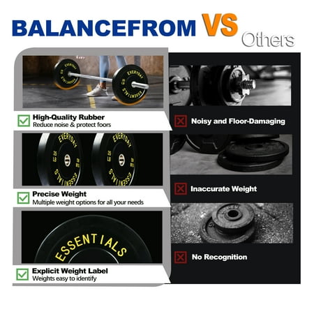 BalanceFrom Olympic Bumper Plates - Sold in Pairs or Sets - Available in Black or Color Whether you're a seasoned lifter or just starting your fitness journey, our bumper plates are the perfect addition to your home or commercial gym. Crafted for durability, ease of use, and versatility, these plates offer a wide range of weight options to suit your fitness needs. Here's why they're your go-to choice: Sold as Pairs and Sets: Pairs Available in: 10, 15, 25, 35, 45, and 55 pounds Sets Offered: 160 Pounds Set: 2x10LB + 2x25LB + 2x45LB Plates 210 Pounds Set: 2x25LB + 2x35LB + 2x45LB Plates 260 Pounds Set: 2x10LB + 2x15LB + 2x25LB + 2x35LB + 2x45LB Plates 370 Pounds Set: 2x10LB + 2x15LB + 2x25LB + 2x35LB + 2x45LB + 2x55LB Plates Key Features at a Glance: 2" Inner Ring Diameter: Compatible with Olympic barbells. Total Diameter: 17.75": Ensures a secure fit on the bar and provides stability during lifts. High-Density Rubber Plates: Designed for durability, they can withstand the demands of intense workouts. Solid Stainless Steel Insert: Provides a secure and snug fit on the barbell, preventing shifting during exercises. Pairs or Sets: Choose individual pairs or opt for a complete set to kickstart or expand your weight collection. Our bumper plates offer consistent and reliable performance, perfect for powerlifting, Olympic lifting, and cross-training. Elevate your fitness routine with quality and versatility - choose our bumper plates for your next workout.