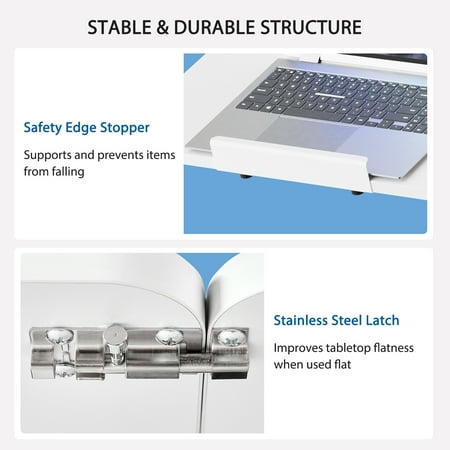 Upgrade your workspace with this Adjustable Overbed Table, designed for convenience and comfort. The gas-spring tilt mechanism offers a 0°-70° adjustable angle, allowing you to position your laptop, books, or devices at the perfect viewing angle. The pneumatic height adjustment (29.5"-43.3") lets you raise or lower the table effortlessly with one hand. Equipped with four hidden caster wheels, the table glides smoothly while maintaining stability with its H-shaped base. A stainless steel safety latch prevents accidental tilting, and the reinforced metal frame ensures durability. Perfect for working, reading, or eating in bed, on the sofa, or