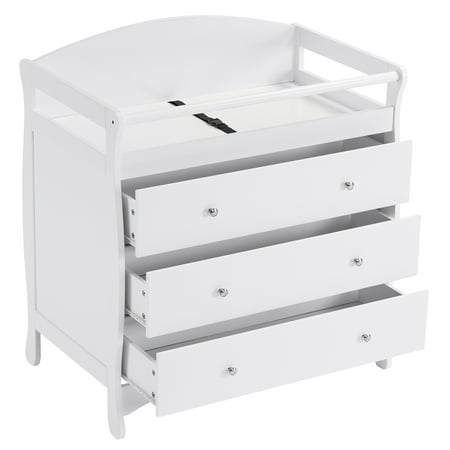 Introductions: This wooden bed has 3 drawers, providing enough storage space to store baby items. And four raised sides and seat belts help keep your child safe. The entire product is made of safe and materials to protect your baby's health. The surface is smooth and can be easily cleaned with a soft cloth. what are you waiting for? Place an order now Features: 1. The storage space of 3 drawers, the size of the drawer is 86*31.5*12cm, provides enough storage space to store baby items, so that the items can be kept neat and orderly, away from dust 2. Four raised sides and seat belts help keep your child safe 3. Dimensions: 99H*90L*58W(cm), the height of this nursing table is very suitable for changing diapers, no need to bend frequently to relieve back strain 4. The combined structure of pine wood and MDF board ensures the safety and stability of the nursing table. The supporting legs are equipped with non-slip pads to prevent shaking and sliding. The whole product is made of safe and materials to protect the health of the baby. 5. Nursing table tops can hold 110 pounds and drawers can hold 33 pounds 6. Smooth surface, the surface can be easily cleaned with a soft cloth Specifications: 1. Number Of Drawers: 3 2. Internal Size Of Drawer: (33.86 x12.4 x 4.72)" / (86 x 31.5 x 12)cm(L x W x H) 3. Drawer Panel Size: (33.86 x 7.28)" / (86 x 18.5)cm(L x W) 4. Overall Product Size: (38.98 x 35.43 x 22.83)" / (99 x 90 x 58)W(cm)(H x L x W) 5. The Maximum Load-Bearing Capacity Of The Nursing Table: 110.23lbs / 50kg 6. The Maximum Load-Bearing Capacity Of The Drawer: 33.07lbs / 15kg 7.Color:White 8.Age group: Baby 9.Brand: Ktaxon Package Includes: 1 x Nursing Table