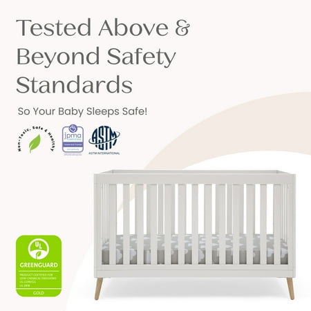 The Essex 4-in-1 Convertible Baby Crib by Delta Children is designed to elevate modern nurseries. It features gently curved corners and splayed feet in a natural finish for some retro-cool contrast. The adjustable height mattress allows this crib to grow alongside your little one-start with the mattress at the highest level, then lower it as your baby begins to sit or stand. Once your child outgrows the crib, convert it to a toddler bed, daybed or sofa. To complete your mid-century modern nursery, pair the Essex 4-in-1 Crib with the Essex Changing Table/Bookcase by Delta Children. Delta Children was founded around the idea of making safe, high-quality cribs affordable for all families. That's why all Delta Children cribs are JPMA certified, and are tested above and beyond industry standards.