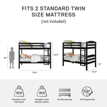Create fun and restful environment with the Leighton Twin-over-Twin Convertible Bunk Bed Frame for Kids. An American classic, its solid wood construction features clean and simple lines, creating a timeless look that easily coordinates with any kid's or guest bedroom style. Available in multiple color options, the detachable bunk bed's horizontal slats and slightly curved headboards come together to pay homage to its Craftsman inspired design. The Leighton is equipped with a 12.5" high guardrail on the top bunk and a secure, easy-to-climb 4-step ladder providing safe access for boys and girls while leaving parents worry free. The sturdy wood slats are built to hold two twin size spring mattresses on the top and bottom bunks. The wood bunk bed can be unstacked to become two stand-alone twin size beds making this a wonderful, versatile choice your children and their friends will love.
