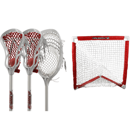 Maverik Lacrosse Mini Lacrosse Set - Indoor Outdoor Lacrosse Set. The set includes two field position sticks, each holds its own soft lacrosse ball. The set also includes one mini goalie stick. The net is made from pvc piping and a strung net. Easy to assemble. Great for Indoor or Outdoor use.