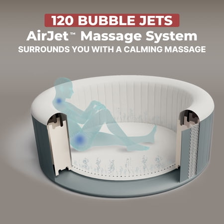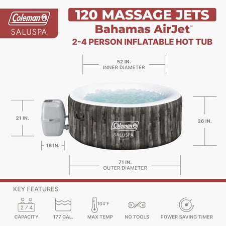 Sink into the warm, bubbling Coleman® SaluSpa® Bahamas AirJet™ 4 hot tub, created by the world’s first portable hot tub manufacturer. A relaxing soak in heated water is great for releasing muscle tension and supporting exercise recovery. The AirJet system features 120 jets that release bubbles from the bottom of the tub to create a relaxing environment. MaxHold™ fabric internal beams provide superior air pressure retention, stability and lightweight portability. The external wall is constructed with 3-layer Tritech® material, proven to be both puncture and damage resistant. Designed with innovative Freeze Shield® technology, internal temperatures stay just above freezing when not in use to prevent damage during colder seasons. This hot tub set features a multi-function pump that runs the inflation, heating and filtration systems, ChemConnect® dispenser that maintains the appropriate chemical level, and a reinforced cover to keep heat in and debris out. Electrical Safety Information: Our spas feature a Ground Detection System that ensures the spa is used with an outlet having a proper ground connection, providing additional electric current protection. Only use a grounded socket corresponding to the electrical rating of the attachment plug (110-120V AC, 60Hz, Single Phase 12A at 68ºF). NEVER use an extension cord or multi-plug adaptor. Be sure to regularly inspect both the plug and socket for signs of damage, and do not plug the product back into the socket if damage is found. Read the manual thoroughly before setting up your hot tub. Outdoor installation is preferred; Indoor installation has special requirements. ATTENTION: Shipping restrictions may apply. This model is not available for sale in the following states: CA, MA, ME, NJ, NV, NY, OR, RI. Residents of these states may select the comparable Bestway model sold with energy-efficient EnergySense® thermal cover to avoid cancellation.