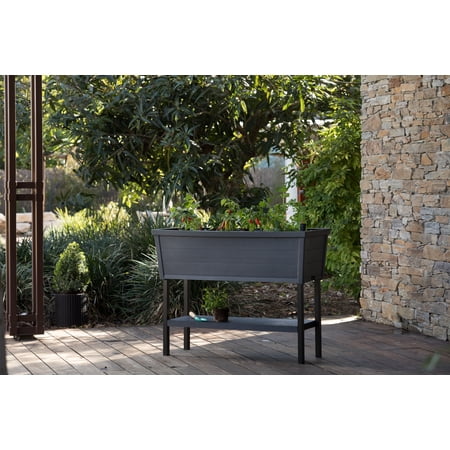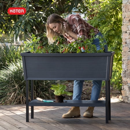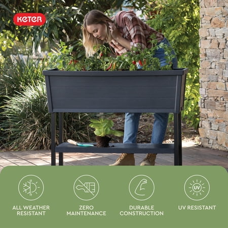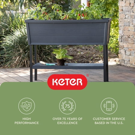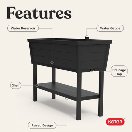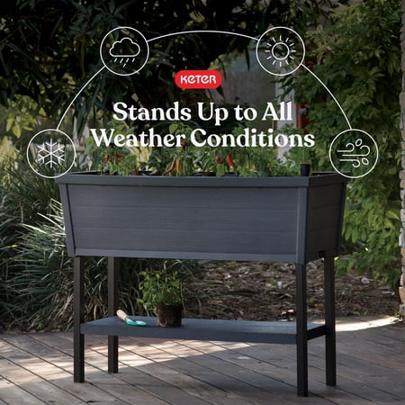 The Alfresco Garden Bed by Keter makes it simple to bring fresh greenery and life to your patio, balcony, deck, or backyard. Its raised height, supported by durable metal legs, allows you to care for your plants comfortably, eliminating the need to kneel or crouch. Perfect for growing vegetables and herbs, this garden bed combines functionality with style to enhance any space. With a smart self-watering system and an easy-to-read water gauge, your plants stay perfectly hydrated without the risk of over- or under-watering. The built-in drainage tab ensures proper water flow and makes transitioning the planter indoors mess-free. Featuring a wood-look finish and heavy-duty resin construction, this garden bed is both beautiful and long-lasting, resisting rust and rot for years of reliable use. Grow your favorite vegetables and herbs effortlessly with this elevated garden bed designed for convenience and durability.