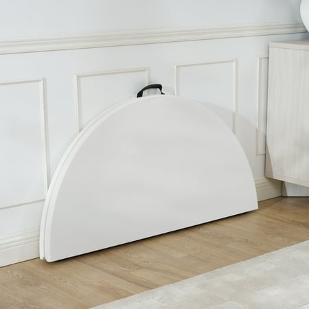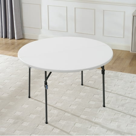 This lightweight Mainstays 4-foot fold-in-half round table is a fantastic choice at any number of events. It offers an ample 48" diameter and a classic white resin surface for lasting durability and easy clean up. Sets up in seconds and our pinch free button allows for easy collapsing of legs. Features an auto locking and unlocking system for folding, plus the carry handle makes it ideal for taking it on-the-go. Perfect for indoor or outdoor use. Add a bit of elegance to your event with this Mainstays 4 ft fold-in-half round table.