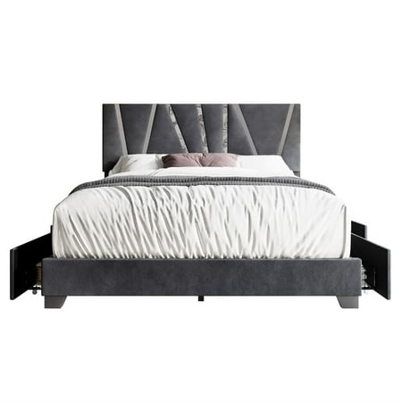 Elevate your bedroom aesthetic with our upholstered storage platform bed, where luxury and functionality blend effortlessly. The velvet-upholstered headboard, featuring striking silver acrylic strip accents, adds a touch of glamour and sophistication to your sleep space. Designed for practicality, the bed includes four spacious under-bed drawers, providing ample storage for bedding essentials, clothing, or personal items, helping you maintain a tidy, clutter-free environment. Built with a full slat system, this platform bed offers exceptional support and comfort, ensuring a restful night’s sleep without the need for a box spring. The perfect combination of style and functionality, this bed is a must-have addition to any modern bedroom.
