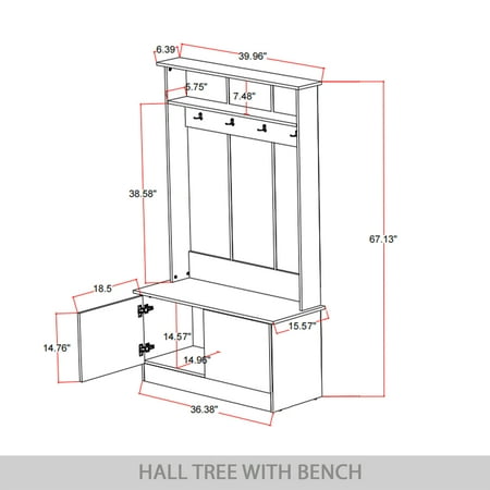 Enhance your space with our Castle Place multipurpose hall tree. Its timeless design complements any interior, offering ample storage. The double prong hook ensures effortless organization. Crafted from solid and engineered wood, it blends durability with sophistication. The legless full-floor design enhances stability and simplifies cleaning. With a built-in bench or seating area and two cabinets with doors, convenience meets elegance. Available in Dark Grey, Light Grey, Brown, Black, and White, it ships in one box for easy assembly and delivery. Product dimension: 39.96L x 15.57W x 67.13H (Weight capacity: 300 lbs)