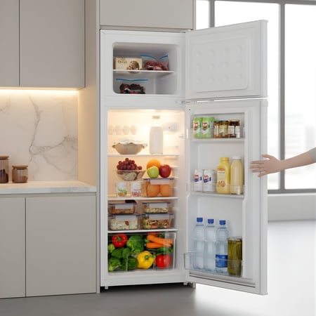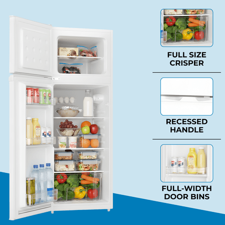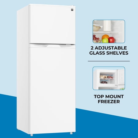 Product Overview The Kenmore 7.5 cu. ft. Top Freezer Refrigerator is a practical solution for smaller spaces that still need reliable food storage. Designed with a compact footprint, this dual-door refrigerator fits easily in apartments, condos, offices, dorm rooms, or secondary kitchen areas.Energy Star certified compressor cooling helps maintain consistent temperatures while using less energy. Inside, adjustable glass shelves, a full-width crisper drawer, and door bins provide flexible storage for everyday groceries and beverages. The separate top freezer keeps frozen foods organized and easy to access.With a reversible door and recessed handle, this refrigerator adapts easily to different room layouts while maintaining a clean, modern appearance. Finished in classic white, it’s a dependable and space-saving choice for everyday refrigeration needs.