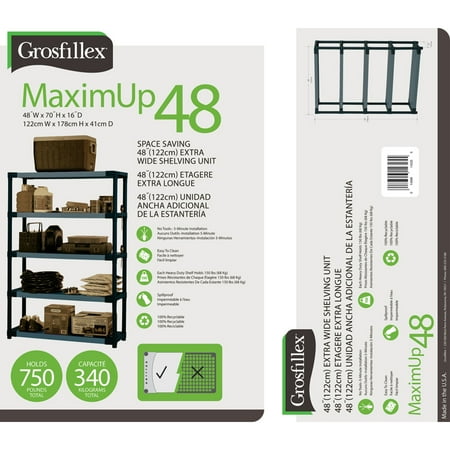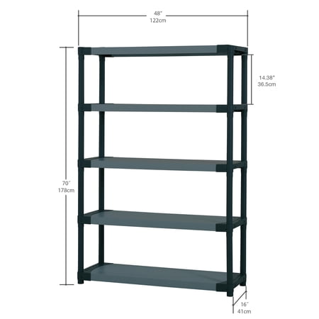 The Grosfillex 48" Resin 5-tier Shelving Unit is a durable and versatile storage solution for your home or office. Featuring solid shelf surfaces that are easy to clean, this shelving unit can hold up to 150 pounds per shelf, ensuring it can support a wide range of items. The included wall mount bracket provides additional safety and stability, while the quick 5-minute assembly without tools makes it a convenient choice. Crafted with high-quality PVC material, this shelving unit is built to last and can be used in various rooms, including the garage, laundry room, basement, closet, pantry, and utility room.