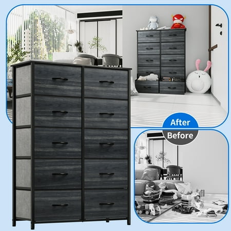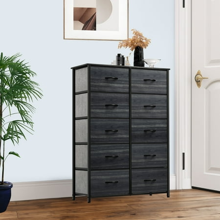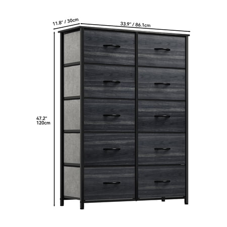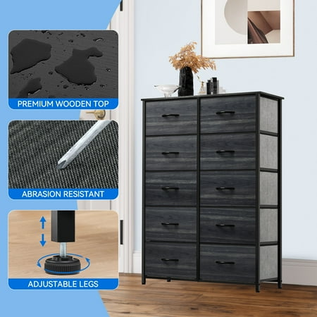 The drawer's front side is constructed with premium cationic polyester fabric; The surrounding sides are covered by breathable, non-woven synthetic fabric; Allows for easy care - simply wipe clean with a damp cloth and let air dry for Adults High-quality wooden boards, Wood top provides a hard surface to place cups, lamps, books and etc. Modern technology, suitable for most decoration styles; easy to assemble; maximum load: 70lbs. Screw-in leveling feet adjust easily on uneven ground and protect the floor from scratches.The Dextrus 10-Drawer dresser conveniently organizes your clothes, scarves, socks, T-shirts, pants, sunglasses, books, small toys, etc.; Overall dimensions: 33.9" L x 11.8" W x 47.2" H; Drawer dimensions: 15.6'' L x 11.0'' W x 8.5'' H.Fixing the fabric dresser to the wall is well recommended. Please follow the instructions.