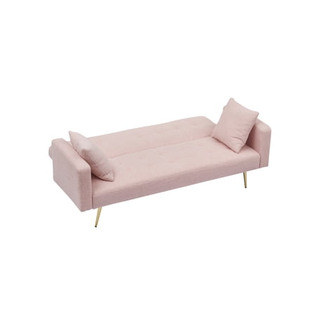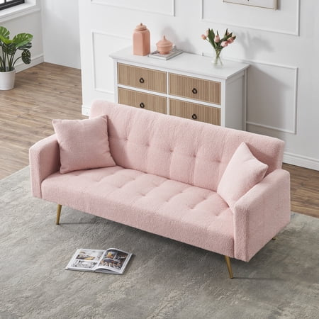 This 71.7-inch Green Teddy Fleece Sofa Bed combines modern style and practical comfort for any living space. Crafted with plush teddy fleece upholstery, it features a soft, velvety texture that invites relaxation while maintaining durability for everyday use. Perfectly accommodating 3 people, it offers ample seating for family time or entertaining guests. •Luxurious Teddy Fleece Fabric: Hypoallergenic, ultra-soft, and easy to clean, the green teddy fleece provides a cozy, premium look and feel. •Sturdy Wood & Metal Frame: Reinforced with solid wood, artificial board, and metal legs, ensuring stability and longevity. Supports up to 500 lbs. •Comfort Meets Convenience: High-resilience sponge filling in the seat and back ensures deep seating comfort, while the removable throw pillows add style and ergonomic support. •Space-Saving Design: Transforms effortlessly into a sleeper bed for guests or overnight use. Measures 71.7”L x 31.1”W x 31.89”H when assembled. •Quick Setup: Includes all hardware and detailed instructions for easy assembly. No tools required. Specifications: • Colors Available: Gray, Beige, Pink, Green • Seat Capacity: 3 adults • Frame Material: Solid wood + artificial board • Leg Material: Metal (black/chrome finish) • Cover Removable: No • Weight Capacity: 500 lbs • Assembled Dimensions: 71.7”L x 31.1”W x 31.89”H • Product Weight: 73.2 lbs • Gross Weight: 77 lbs Ideal For: • Living rooms, apartments, or guest areas seeking a stylish, functional seating solution. • Families or small households needing extra sleeping space without compromising style. Care Instructions: • Spot clean with a dry cloth. Avoid water to preserve fabric quality. Why Choose This Sofa Bed? Blending comfort, durability, and versatility, this teddy fleece sofa bed adapts to your lifestyle, offering a cozy retreat by day and reliable guest accommodation by night—all in a sleek, low-maintenance package.