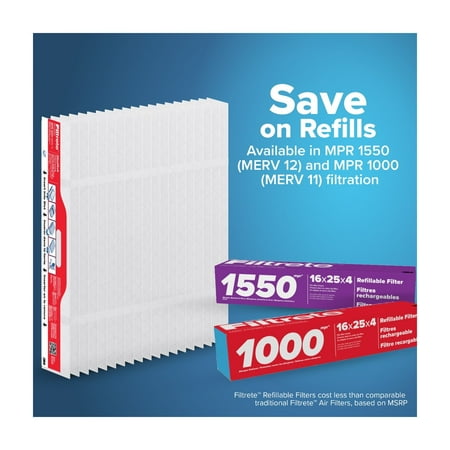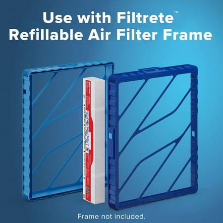 The Filtrete Refillable Air Filter comes with two collapsable air filters. These fit in the Filtrete Brand Refillable Air Filter frame, which is designed to last for up to 20 years. The filter captures 2X more microparticles than the MERV 11 minimum requirements and is Certified Asthma & Allergy Friendly, while creating 20% less waste. Save money on refills with collapsible filters that take up 75% less space than traditional air filters, and are packaged with curbside recyclable materials. The refillable filter lasts up to a year, and never sweat forgetting to replace the filter with 90, 180, and 365-day reminders from the Filtrete Smart App. It's a small change, with a big impact. Excludes damages, abuses, or alterations. Microparticles are 0.3- 1.0 microns in size. Based on weight. Comparable to equivalent size and Filtrete MPR Air Filters, based on MSRP.