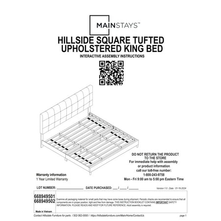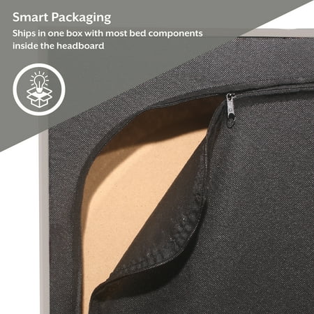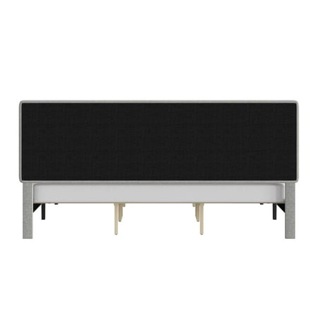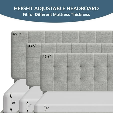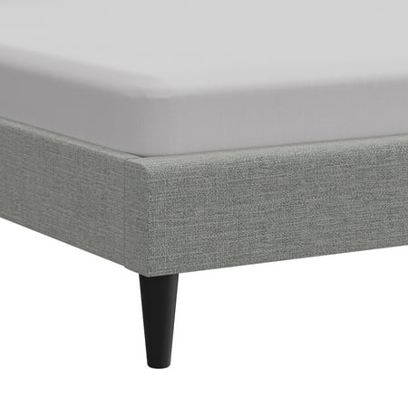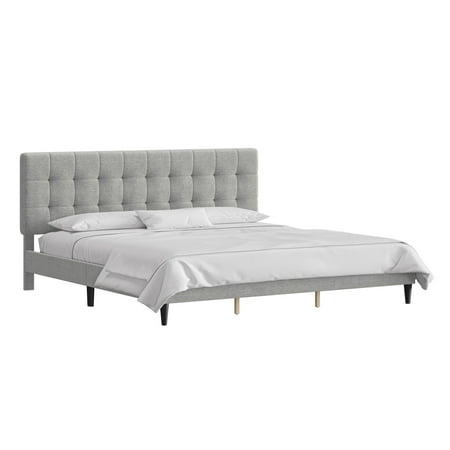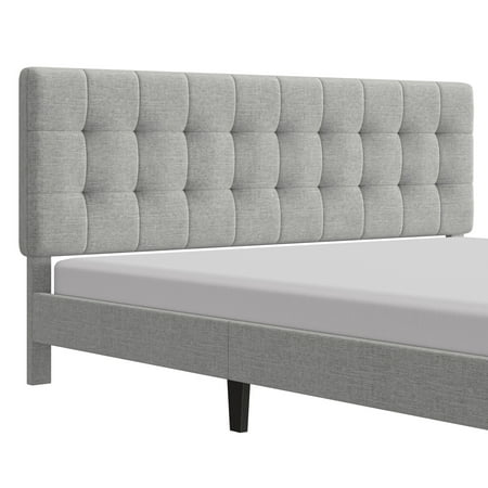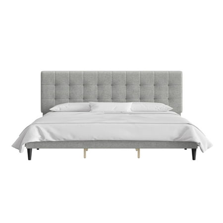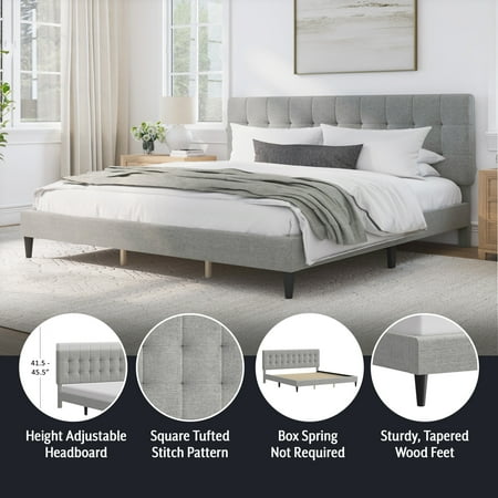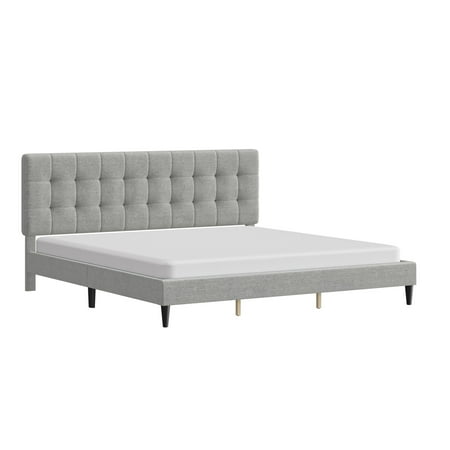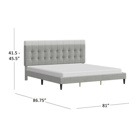 This low-profile king bed features a headboard with tasteful square tufting that creates a minimal luxe effect. The absence of buttons on the tufting lends an intriguing, modern quality to this otherwise casual piece. Elegant in its simplicity, this adult bed is fully upholstered in a soft light gray for a uniform look, and the tapered legs are finished in a contrasting black. This contemporary platform bed boasts a distinctively chic adjustable headboard with three height options to fit your preferred mattress height. A box spring isn’t required. Mattress required; not included. Assembly required.