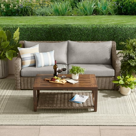 The Better Homes & Gardens Bellamy 1 Piece Coffee Table features an e-coated and powder-coated steel frame and handwoven all-weather double wall wicker. The table features a faux wood-look slat top and a woven wicker lower shelf for a luxe deign element while offering an an added bonus of practicality to store extra outdoor throw pillows, books, etc. This outdoor coffee table set is ideal for your patio, deck, or porch. Shop the full Bellamy patio collection for more coordinating furniture items. 3-year limited warranty on frame, 1-year limited warranty on wicker.