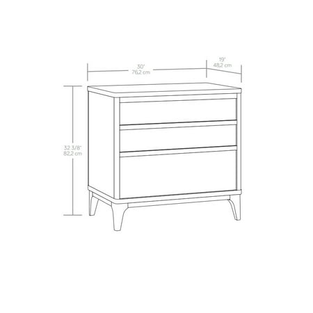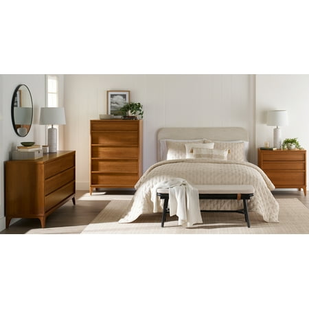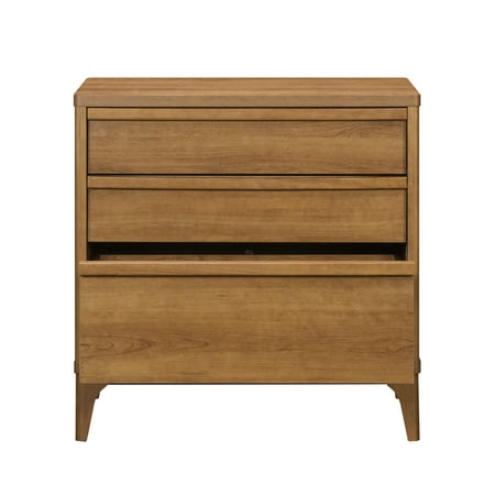 Add a touch of mid-century modern elegance to any home with this stylish 3-drawer side table from the Better Homes & Gardens Greyson collection. Featuring a natural wood look with a warm Acorn finish, this contemporary nightstand is designed to complement any decor. The solid wood feet of this engineered wood nightstand not only provide stability but enhance the durability of the piece, ensuring it will be a long-lasting addition to the home. Each of the three spacious drawers glide smoothly on metal runners and includes safety stops, making it easy to access bedroom or living room essentials. The interlocking safety mechanism on this 3-drawer nightstand ensures that only one drawer can be opened at a time, preventing accidental tipping and enhancing safety. Additionally, a tip restraint safety strap is included, providing extra security for this mid-century modern nightstand. With the perfect blend of form and function, this retro bedside table with drawers offers ample storage space while adding a sophisticated, timeless aesthetic whether standing beside a bed, a sofa, or all on its own.