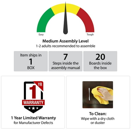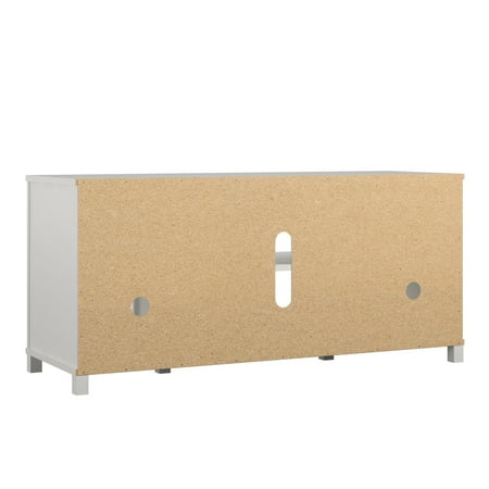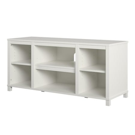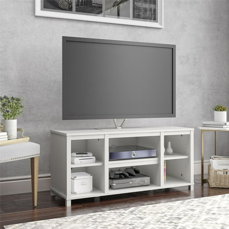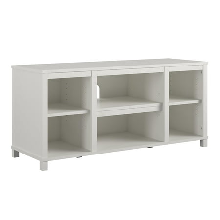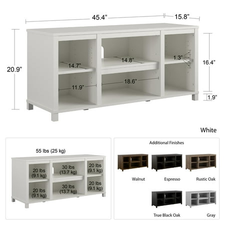The Mainstays Parsons TV Stand is just the right size for your flat paneled TV up to 50" wide. This TV Stand has tons of open storage so you can keep your cable box and gaming system in the 2 center shelves and still have room to organize your books, remotes and DVDs on the other 4 shelves. The wire management holes in the back panel keep your cords organized and tangle free. With a laminated particleboard build, the crisp white finish adds a modern touch to your space. The TV Stand ships flat to your door and requires assembly upon opening. Two adults are recommended to assemble. Once assembled, the TV Stand measures to be 20.875"H x 45.375"W x 15.75"D.