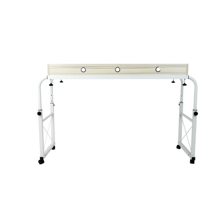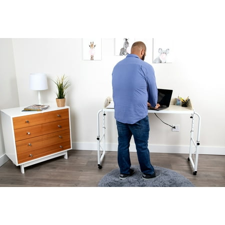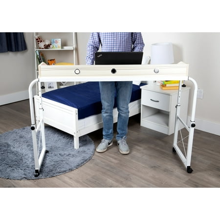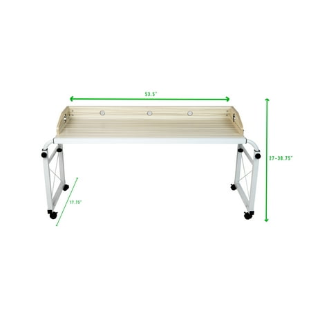 Improve your workspace with a Mind Reader adjustable height and width desk. One of the most difficult struggles when working from home is finding a suitable location to work, then maintaining that space throughout the day. Sometimes you don’t have a dedicated desk and computer setup, or you may just want to work from somewhere different for a while. This adjustable sitting and standing desk from Mind Reader products makes it easy to create a flexible workspace situation wherever the mood strikes you. The versatile functionality makes it easy for you to position it over your bed, or use it independently as a mobile desk. 360° rolling casters make it easy to relocate the desk wherever you need it, while the locks on each wheel ensure that your Mind Reader desk remains securely in place once you’re situated. The adjustable width allows the desk to extend and roll over beds, so you can work from the bedroom or family room. The raised edges around three sides keep supplies in place, while a series of stylized cutouts allow for attractive and efficient cable management for whatever electronics you may use. Need to change positions and get on your feet for a while, or simply have a taller bed to fit the frame over? Adjust the height from 27″-36.5″ and use the desk as a standing desk. When you’re done, roll it away until you need it again. The stylish wood finish and white powder-coating make this Mind Reader adjustable desk a home workstation essential. Assembled Dimensions: 17.75″ L x 53.5″ - 63.5″ W x 27.5″ - 38.5″ H Materials: Powder-Coated Steel, Particle Board