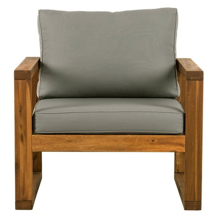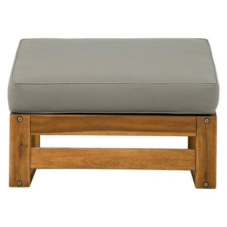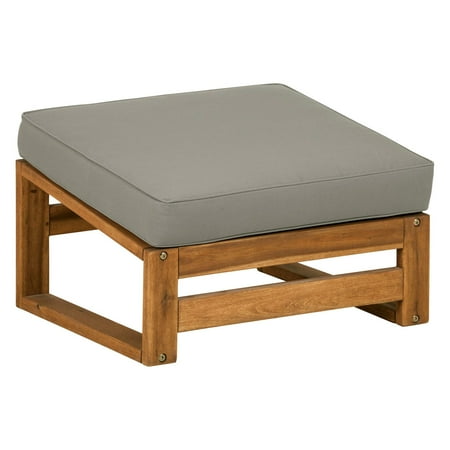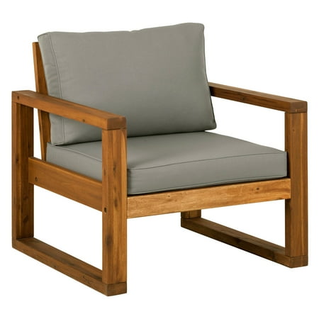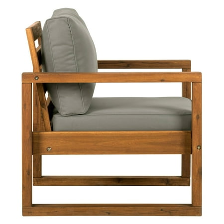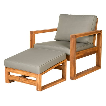 The Walker Edison Open Side Patio Chair and Ottoman with Cushions invites you to stretch out and relax outdoors. Sturdy, durable acacia wood is dyed a natural finish that accentuates the wood grain, with the plush gray cushions serving as a subtle contrast. The open-side design is suited for poolside conditions. Rest your feet on the unique ottoman that's slanted for your comfort. This set arrives ready to assemble with convenient step-by-step instructions.