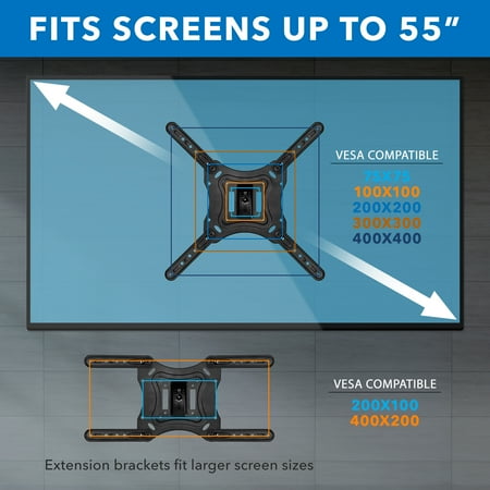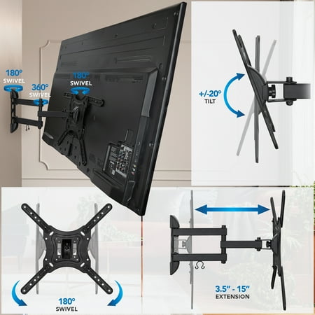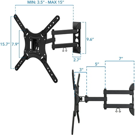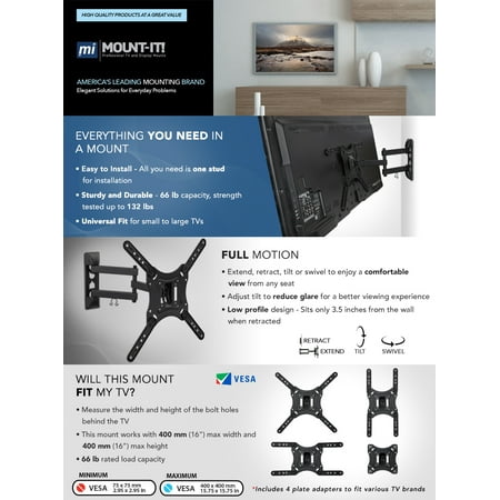 Mount-It! Full Motion TV Wall Mount Monitor Wall Bracket with Swivel and Articulating Tilt Arm Mount-It! MI9901X is a versatile TV wall mount for small to medium size televisions. Its articulating arm offers full motion capability to adjust your TV for optimal viewing experience. Simply pull the TV await from the wall and turn it left or right to fined your ideal view location. The arm is ideal for corner installation and can extend up to 15.7 inches. The single stud installation, simplifies the placement of the TV on the wall. This wall mount bracket is also ideal for large computer monitors from sizes 30, 32, 34, 35 and ultrawide monitors with larger VESA patterns. Install you monitor on the mount to improve your posture and to clear up space on your desktop. All necessary instructions and hardware are included. MI-4110 Manual