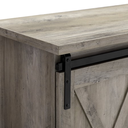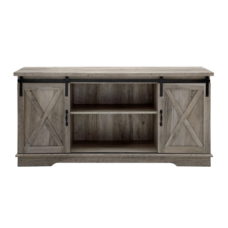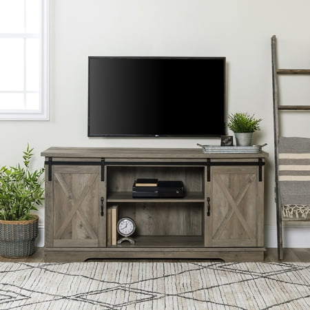 With a stand-out design, this 58 inch storage console from Manor Park will integrate style into your home. This TV stand will give your living room a charming country feel, while also providing plenty of storage space for your electronics and de9cor. Featuring two sliding barn door styled cabinet fronts for a versatile design where you can either close off the middle or both sides, depending on your needs. Adjustable shelving and cable management make it simple for you to keep your electronics in one place. This media console is constructed of high-grade MDF. The modern farmhouse style of this entertainment center will become a piece in your living room you?ll admire.