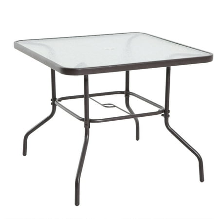 The Albany Lane Six-Piece Folding Dining set is ideal for small gatherings, on smaller decks and patios. It includes a dining table, four sling folding chairs and a market umbrella. The dining table features a waterwave tempered glass tabletop for safety and durability with a pre-cut umbrella hole. The portable sling folding chairs features a durable powder-coated finish and sturdy steel construction. This set is available in three color options to fit your patio needs. Each set is sold separately.