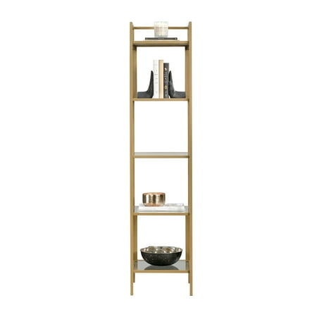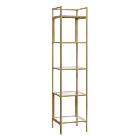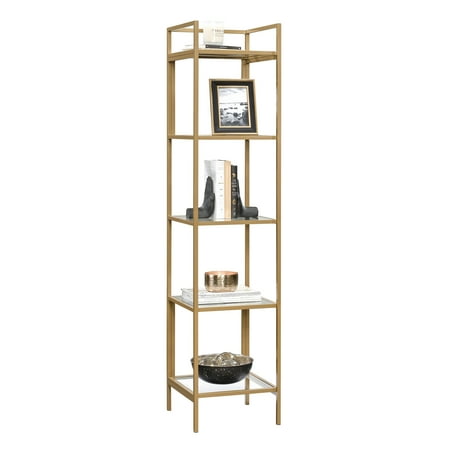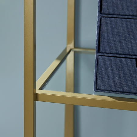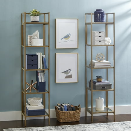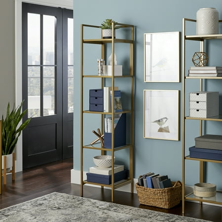 It's time to elevate the style in your home. Add a touch of sophisticated style while creating versatile storage and display space with this narrow bookcase from the Better Homes & Gardens Nola collection. This tall bookcase features five safety tempered glass shelves. These spacious shelves are ideal for storing a variety of different items like stacks of books, work binders, and organizing bins. They also make the perfect spot to display all your favorite things like your collection of knick-knacks, decorative plants, and photos of your family and friends. There?s a place for all your things! This stunning bookcase is finished on all sides for versatile placement throughout any room in your home ? the living room, your office, or even in the bedroom. Its sturdy metal construction ensures that it is built to last. Finished in Gold, this charming Better Homes & Gardens Nola Narrow Bookcase will give your home the style you have been looking for.From book cases to TV stands, Better Homes & Gardens furniture is designed to help you organize your home. Look for a new dresser for your clothes, display your favorite books with a bookcase or create your home office with a desk and a cube organizer. You'll also find kitchen and dining tables, chairs, living room, and kids' furniture.