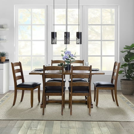 Enhance your dining room with the Better Homes and Gardens Granary Modern Farmhouse Ladderback Dining Chairs 2-pack. Inspired by the popular farmhouse style, each chair features simple, yet stylish ladder back design. The rich brown tones of the Aged Brown Ash finish brings out the beautiful, natural patterns of the wood grains. The seat is wrapped in a black faux leather upholstery that accent the deep brown tones of the wood finish. Thanks to the sturdy wood and wood veneer construction, you can trust that these chairs were built with durability in mind. The ladder back is not only stylish, but also provides contoured support for your back. The seat is generously padded to make your dining experience even more comfortable. The Granary Dining Chairs pair with the Better Homes and Gardens Modern Farmhouse Dining Table and also coordinate with several other furniture pieces in the BHG Granary Modern Farmhouse Collection. All sold separately. Whether it's in your kitchen, dining room or any room in your home, the Granary Modern Farmhouse Dining Chairs will be a sturdy and stylish solution to fit your needs.