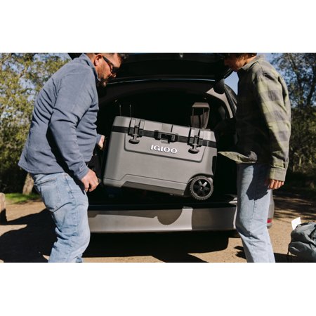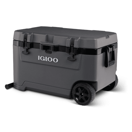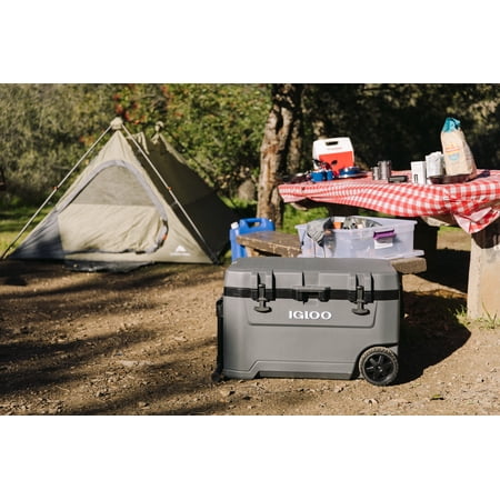 The Igloo Wheeled Overland 72 Quart Roller Cooler is built tough for your journey outdoors! The extra-thick 1.5-inch foam-insulated walls and insulated lid, provide dependable, long-lasting ice retention, keeping food and drinks chilled. Secure the lid with it's durable rubberized latches so things won’t spill out. For added security, use with a standard lock (not included) on the built-in locking plates. The 72 quart Overland is easy to roll with oversized, multi-terrain, soft-glide wheels and a comfort-grip tow handle. This cooler is loaded with convenient features, like a bottle opener, UV inhibitors which help prevent sun damage and a threaded, tethered drain plug for easy emptying of melted ice. at Igloo’s manufacturing plant in Texas. Dimensions: 31" x 18" x18.