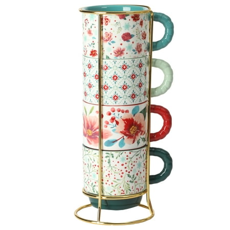 The Merry Meadows 5-piece Stoneware Mug Set with Gold Metal Rack from Pioneer Woman captures the feeling of proudly sharing a charming find from a quaint flea market to family and friends. Perfect for a service for four, this set comes with four 12.5oz mugs and one gold-tone metal rack. These mugs bring a little country charm to both casual everyday dining as well as formal occasions. Stoneware craftsmanship offers strength and durability to keep up with daily specials and frequent washing. Embellished with beautiful floral designs, the exterior of each mug offers warmth and vintage charm when serving your favorite hot or cold drink, whether it's tea, coffee, eggnog, juice or hot cocoa. The floral patterns lend an artistic style, making the dinnerware a set of collectibles to use or display in the kitchen or cupboard. The bases feature a vibrant trim to add a pop of color, while elegantly defining and contouring the shape of each mug. Each mug has a sturdy handle to provide a comfortable grip when lifting and sipping. When not in use, stack the mugs and organize them in the gold-tone metal rack to save space on any countertop. Mix and match this mug set with other tabletop pieces in bolder colors or intricate patterns to complete an impressive and welcoming table spread at home. The beautiful design and construction of the set makes it as a thoughtful gift for birthdays, housewarmings, weddings and other special occasions. Friends who love to host and entertain, newlyweds and aspiring home cooks would appreciate receiving a nice and elegant gift like the Pioneer Woman Merry Meadows 5-piece Stoneware Mug Set with Gold Metal Rack. Meet Ree: Ree Drummond is a NY Times Best Selling Author, TV personality, social media phenom, and the woman behind the popular Pioneer Woman lifestyle blog that started it all. She's also a lover of butter, basset hounds, Ethel Merman, her hunky, cowboy husband Ladd, and their four kids. Her casual country style and delicious recipes have made her a go-to for all things cooking and entertaining.