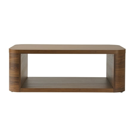 Elevate your living space with the Better Homes & Gardens Juliet Coffee Table in a rich walnut finish. This modern rectangular coffee table features a stylish design with a visible woodgrain and an open structure accentuated by curved edges, creating an airy and comfortable feel. The Juliet Coffee Table offers a spacious tabletop perfect for serving snacks, beverages, or displaying decorative items. The lower shelf provides additional storage for books, plants or baskets to hold remotes. Crafted from quality MDF and particle board, this durable piece supports up to 100 pounds and comes with adjustable feet for stability on uneven floors. Ideal for living rooms, lounges, or studies, this contemporary walnut coffee table combines functionality with elegant design. Assembly is required.