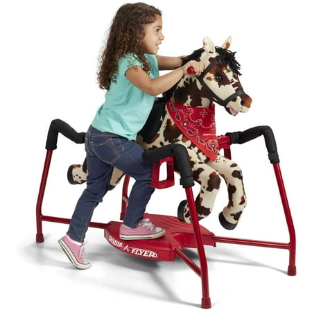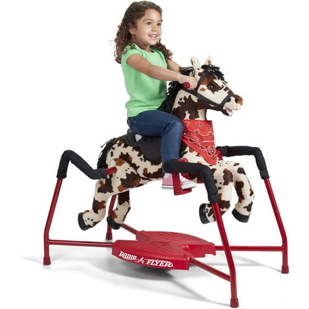 Meet Freckles, the next best thing to a real horse! This plush spring horse responds to your child’s motion with life-like sounds that change based on how fast your child rides: walking, trotting and galloping. The plush coat and padded head invite hugs, and the saddle keeps your child in place while riding. Freckles encourages imaginative play by responding with eating sounds when “fed” the carrot accessory, and the soft yarn mane and tail can be brushed with the comb accessory. The spring covers and the patented EZ Climb step add safety.
