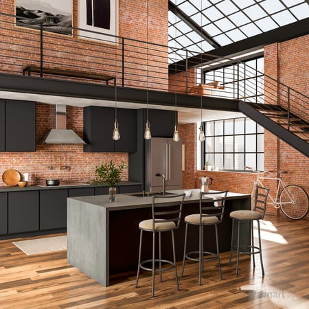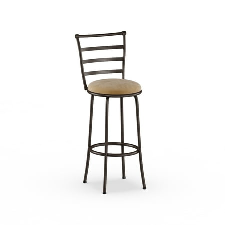 The Mainstays Adjustable-Height Swivel Barstool, Hammered Bronze Finish, Set of 3, Multiple Colors has a sturdy metal frame, a ladder back design, and a convenient circular footrest to enhance your comfort. It also features a 360-degree swivel enabling you and guests to turn in any direction effortlessly. You can choose from vinyl espresso or tan microfiber seat cushions. The Mainstays Adjustable-Height Swivel Barstool comes with interchangeable legs that allow for 24 and 29-inch seat heights depending on your needs. This transitional style with the simple ladder-back design fits seamlessly into nearly any decor. It is ideal for use at a breakfast bar, kitchen island, home bar, or counter-height table. This padded barstool comes with tools and all necessary hardware for a quick and easy assembly.