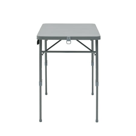 Provide all of the table spaces that you need in all kinds of settings with the Mainstays 40" Fold-in-Half Table. This versatile rectangular table is sturdy and durable, made with reliable materials, folds for easy storage and transportation, and adjusts to three different heights. When you're finished using it, just fold in the metal legs, fold the table in half, and your new compact table is ready for transport! Its classic color is sure to fit in at any gathering in any setting, and its spacious expanded 40" long table-top is ideal for holding a wide variety of foods, crafts, or whatever items you are working with! It's great for everyday use both indoor and outdoor, as a serving table, craft supply table, outdoor meal table, or for whatever purposes you may need. The plastic tabletop is easy to clean with no fuss just wipe it down with a damp cloth, and it will look as good as new! The carrying handle makes it perfect for taking on the go, for outdoor barbecues, game nights, school activities, parties, or tailgating events. The tabletop is large enough to be able to sit the whole group down around the table, so all of your friends and family can be included.