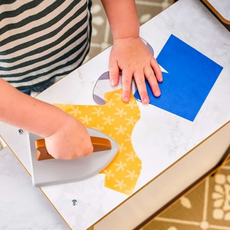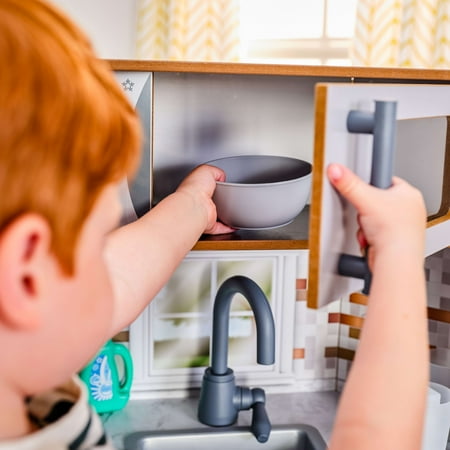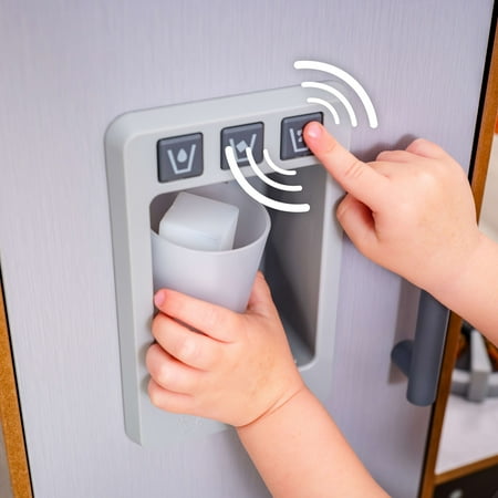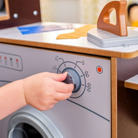 Give your kids the ultimate cooking and laundry combo play set with KidKraft's Elegant Espresso Corner Play Kitchen. The angled design makes it ideal for placing in a corner to cover two walls, making it fit better in most rooms. From the stove to the sink and the laundry area, there's plenty of room for multiple kids to play. Made of long-lasting, durable wood and in an attractive brown hue, this play kitchen will be a favorite for both boys and girls. Place a cup in the ice maker and press the buttons to hear three sounds and watch ice cubes dispense. Likewise, the two stovetop burners light up and make sizzling sounds. All knobs make a clicking sound when turned, adding to the realism. Handles on the microwave, oven, refrigerator and freezer give kids lots of places to pretend prep and cook. A sink in the middle is enhanced with a tile-like graphic backsplash and boasts two open shelves for storage. Lastly, a washer is ready to clean up all laundry. Practice with the included "clothes" and detergent bottle. An extended shelf doubles as an ironing board, complete with iron. All accessories included are in neutral, coordinating colors. Set up this wooden play kitchen in any room of your home to keep kids playing for hours.