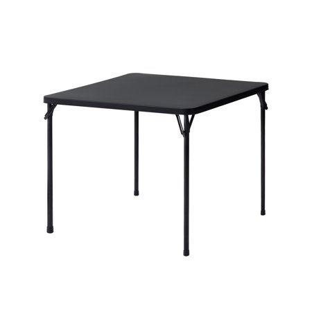 Provide all of the table space that you need in all kinds of settings with the Mainstays 34inch Resin Plastic Card Table Black. It's great for everyday use both indoor and outdoor, as a serving table, craft supply table, outdoor meal table, or for whatever purposes you may need. Constructed with sturdy steel tube and plastic surface that is easy to care for, just wipe down with a damp cloth and it will look as good as new! Plus, you won't need to worry about clutter, this card table can be folded up completely for easy storage and transportation. Best of all, it is big enough for four people to play games, make crafts or share a meal. Be prepared for whatever may come your way with the Mainstays 34inch Resin Plastic Card Table Black!