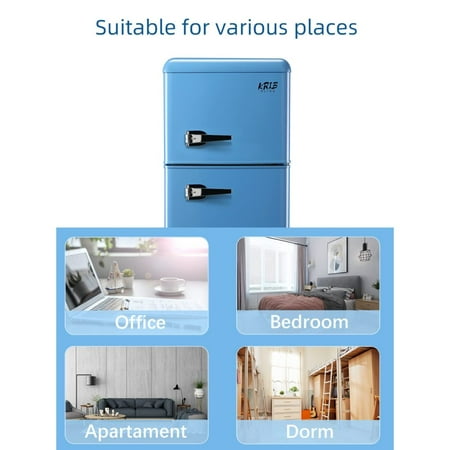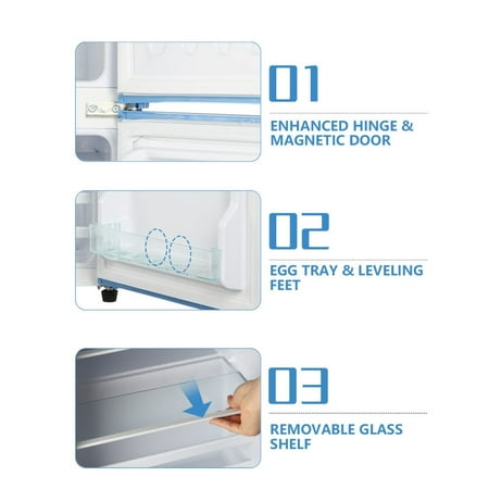Top Freezer Design: The large capacity of 3.5 Cu.Ft is divided into refrigerator and freezer areas, which are more spacious than ordinary mini refrigerators and can keep food fresh or frozen. And the stylish two-door design can be opened left and right, which is very suitable for dormitories, offices, bedrooms and apartments.Temperature Control: The compact refrigerator has 7-level temperature control, according to the change of the external environment, select the appropriate temperature level, more humane.Fashion Appearance: The appearance of this fridge is retro and fashionable. With chrome handle design, simple and generous without losing style. The cabinet body is designed with rounded corners, not afraid of bumps, and children are safer.Removable Glass Shelf: Equipped with two removable glass shelves, it can distinguish different kinds of food. Store your food or drinks flexibly, easy to take out and clean.Energy-saving Bass: This fridge uses high-efficiency compressor, low-noise operation, sleep soundly all night, enjoy a good time.