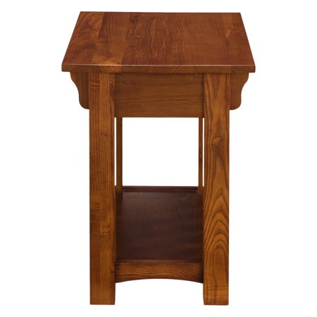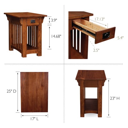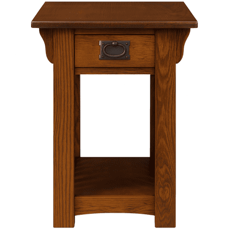 The Leick Home Mission Impeccable Living Room End Table shows off real wood grain, slatted sides, and black hardware for a true Mission style. A strong shelf under the single drawer adds storage and style to this sturdy, solid wood table. Finished in medium oak, this well-made side table brings warm Shaker design to your living room or bedroom. It’s built from solid North American ash wood with a durable, hand-rubbed finish. Just attach the slatted posts and it’s ready to use. This wood side table works great as a living room end table, bedroom nightstand, or office printer stand. It’s easy to put together with a pre-assembled drawer. Designed and made by Leick Home, the trusted source for quality furniture for every taste and budget.