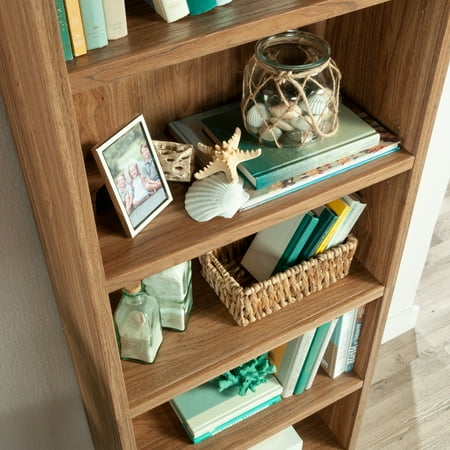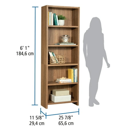 Unlock limitless organization possibilities with the Mainstays Westley collection 5-shelf bookcase – because there's no such thing as too much storage space. This tall and handsome tall bookcase offers five spacious shelves, providing ample room for storing and displaying everything from novels and cookbooks to trending home décor and family photos. Take control of your storage needs with three adjustable shelves, allowing you to customize the height and create flexible storage options for items of all shapes and sizes. This versatile engineered wood bookshelf caters to your unique treasures, ensuring there's a dedicated space for each one, while the strong and lightweight 1-inch panel construction ensures durability without compromising on style. With its simplistic design and charming style, this display bookcase seamlessly enhances any room in your home. Finished in Warm Walnut, this beautiful 5-shelf bookshelf not only fulfills your storage needs but also adds a touch of elegance to your living space with the perfect blend of functionality and style.
