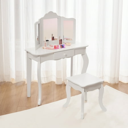 Your Zone Kids Vanity Table and Stool Set,White Color,Age 3+ With 3 Mirrors is a fun addition to playing dress-up. Made of durable wood with rounded corners and carved cabriole legs, the vanity table features a tri-fold acrylic mirror and a small drawer with plenty of space for makeup, jewelry, brushes, and other must-haves. The matching stool features the same white color. Compact in size to fit in a playroom or bedroom.