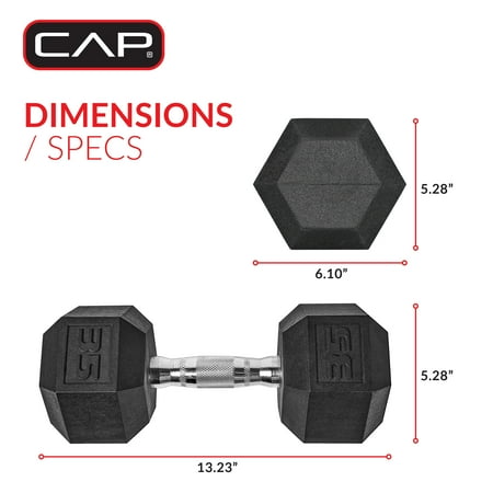 Enhance your workout routine with the CAP Barbell Coated Hex Dumbbell. This sturdy dumbbell is a premium quality weight that's ideal for home use. Made of solid cast iron with a protective black coating, it features an easy-to-grip handle and encased heads to prevent damage to floors. The ergo designed handle helps to reduce hand fatigue and maximize comfort, while the knurling prevents the dumbbell from slipping during workouts. The Hex shaped dumbbell heads ensure the dumbbell will not roll when set down, avoiding injuries and allowing for easy storage. Dumbbells can be used to exercise all major muscle groups, including arms, chest, back, abs, legs and core. Making them perfect for a full body workout. Sold individually.