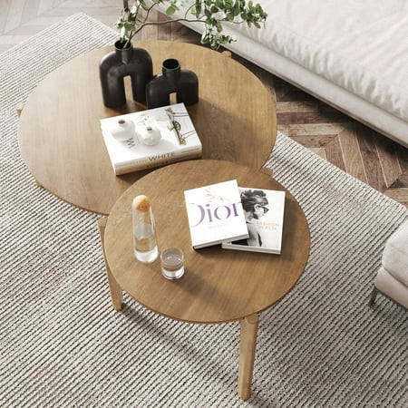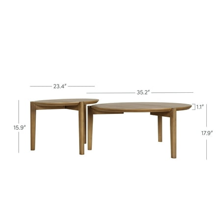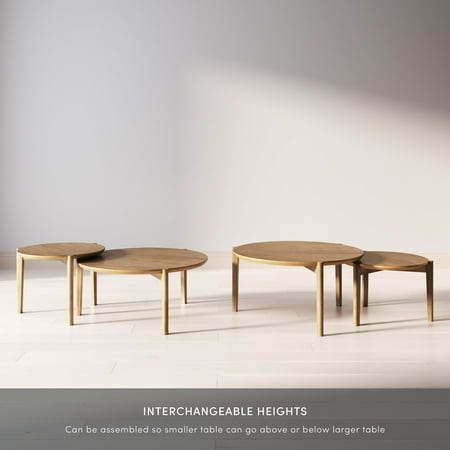 Meet Kendall, a 2-piece coffee table with a beautiful wire-brushed finish that will complement your mid-century modern home. This nesting coffee table set includes a smaller piece and a larger table that you can stack interchangeably -- yes, you can place the smaller table above the larger table, or vice-versa! You can also use them separately as round cocktail tables or accent end tables in your living room. Kendall features slim yet sturdy tapered legs and bull nose table edge details making it such a unique and modern coffee table set. And the best part is it only takes 20 minutes to put together! Nathan James is the furniture company built for this generation. You don't need to spend a fortune to get quality design-first furniture and when we say easy assembly, we mean it. Our guarantee is our word. Your purchase is backed by a 100% money-back guarantee. If you have any quality issues just contact us and we will send you a replacement immediately, no questions asked. This product is not recommended for commercial use.