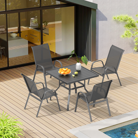 Description:< br > These Vitarpatio patio chairs are perfect for family/friend gatherings, dinners, parties and other outdoor activities, and will bring you the best comfort experience. The sturdy powder-coated metal frame enables this stackable chairs to easily bear up to 300 pounds. Our metal outdoor chairs are made of high quality textilene fabric, which is comfortable, breathable and quick-drying, ensure that you won't feel stuffy or sweaty even when sitting for a long time in the hot summer, bring you the best sitting experience. The curved armrests and high backrests of metal patio chairs support your arms and lumbar, relieve pressure and release fatigue, bring you deep relaxation. The spacious seats of patio dining chairs allows you to have more space to move around, and you can freely stretch your body and enjoy the ultimate comfort. When not in use, you can stack these patio chairs set of 4 and store them in storage room, it will not take up too much space and avoid the trouble of storage, is the best choice for your patio furniture chair.< br >< br > Features: Save Space: The outdoor chairs adopt a stackable design, which is convenient for storage and saves space. Lightweight: The outdooe stacable chairs are lightweight, easy to move, it is rust-proof, durable and low maintenance. Ergonomic Design: The lawn chairs feature tilted high back and spacious seats, perfectly fitting your body lines and offering deep relaxation. Curved Armrests: With ergonomic curved armrest, which can support your arms, let your arms can stretch naturally, enjoy the ultimate comfort. Extra Wide Seats: The widened 19.29 inch seats are more spacious and offer you a more comfortable experience. Textilene Fabric: The stacking dining chair with textilene fabric seat and backrest, it is comfortable, breathable and skin-friendly, quickly drying, you will not sweat even sitting for a long time in summer. Sturdy Metal Frame:The sturdy anti-rust steel frame is stable and durable, each stacking chair can bear up to 300 lbs. Non-slip Foot Pads:Equipped with non-slip pads, it not only prevents the stackable dining chairs from sliding when in use, but also stops scratching the floor. Backrest Support Rod:The sturdy backrest support rods provide strong support for the backrests of outdoor metal chairs and prevent collapse. Easy to Assemble: Each part is labeled and marked, you can put together the stackable chairs set of 4 easily according to the instruction. < br > Specification: Type: Stackable Dining Chairs Set of 4 Color: Gray Material: Textilene Fabric, Metal Overall Dimensions of Each Chair: 21.7 x 25.5 x 36.5 inch (D x W x H) Seat Height: 16.5 inch Net Weight of Each Chair: 8.5 pounds Weight Capacity of Each Chair: 300 pounds Style: Simple and Modern Product Care Instructions: Wipe With a Dry Cloth. Package Includes: 4 x Patio Stacking Chairs 1 x Instruction