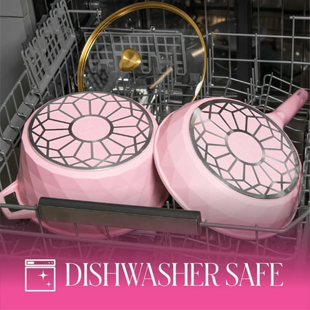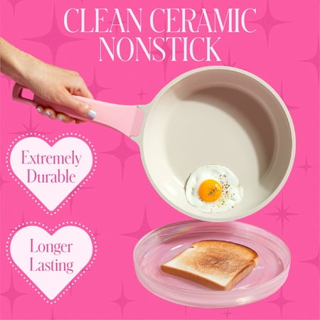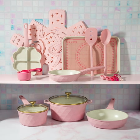 Transform your kitchen into a glam culinary playground with the Paris Hilton 25-Piece Diamond-Faceted Cookware & Bakeware Set. Featuring a mix of essential cookware, bakeware, and tools, this set has everything you need to cook, bake, and serve in iconic Paris style. The set includes: 8" fry pan, 10" fry pan, 2-quart saucepan with lid, 4.6-quart Dutch oven with lid, 8.25" 4-section heart pan, Spoon, Slotted turner, 10-piece measuring set, 4 felt pan protectors, Medium 15” x 10” baking sheet (oven safe up to 425°F), 15” x 10” baking mat (oven safe up to 425°F). Crafted from cast aluminum with a chic diamond-faceted exterior, this cookware heats quickly and evenly for better cooking results. The Clean Ceramic™ nonstick coating ensures easy food release and quick cleanup, so your recipes look as good as they taste. Cookware is dishwasher safe, though hand washing is recommended to keep the finish looking flawless. The baking mat and sheet add extra versatility, making it easy to go from stovetop to oven. Suitable for gas, electric, and glass cooktops (not induction). Make every meal a moment with this Paris Hilton all-in-one cookware set—because your kitchen deserves to sliv too.